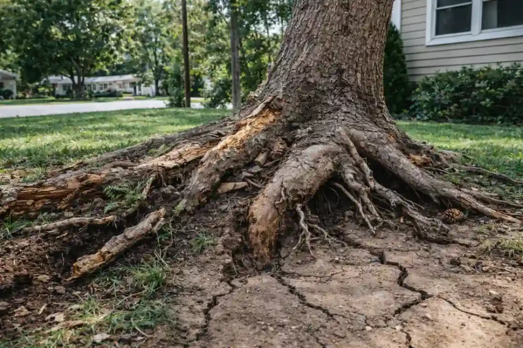 Roots are the foundation of a tree. If roots are visible, cracked, or lifting from the ground, the tree may not be securely anchored and can fall with little warning.